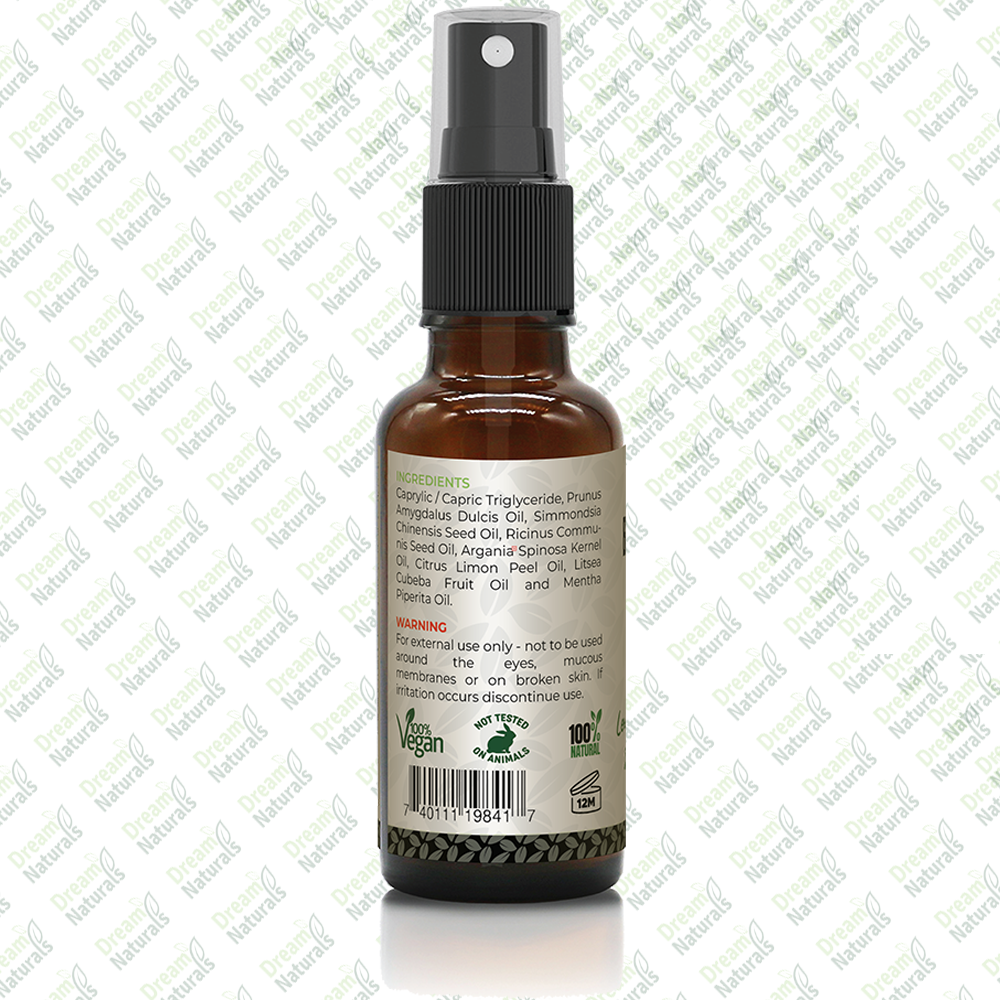 Caprylic / Capric Triglyceride, Prunus Amygdalus Dulcis Oil, Simmondsia Chinensis Seed Oil, Ricinus Communis Seed Oil, Argania Spinosa Kernel Oil, Citrus Limon Peel Oil, Litsea Cubeba Fruit Oil and Mentha Piperita Oil.